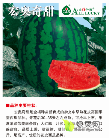 宏奥奇甜是全福种苗新育成的杂交中早熟花皮高圆果型西瓜品种。开花后30-35天左右成熟可抢早上市果皮浓绿带美丽条纹;大红瓤汁多含糖量14度左右口感甜爽品质上乘耐运输耐储存。果实可达8-10公斤是丰产、优质的花皮西瓜品种。